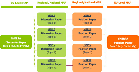 - Regional and National MAP Position Paper: Document summarising the opinions of the MAP on a specific topic. The set of position papers from the local MAPs were used in the EU MAP to prepare a single ‘SHERPA position paper’. All documents are available here.